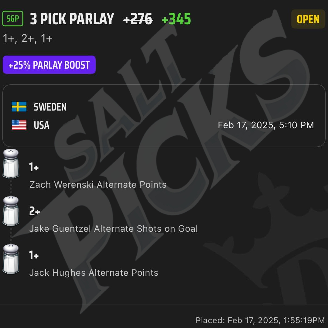 Today USA takes on Sweden in the final group play game of the 4 nations face-off. USA has already clinched a spot in the title game against Canada on Thursday night. But don’t expect them to step on the brakes tonight. Now that they are in Boston tonight the high energy should continue. I put together a 3 leg parlay for tonight’s action.